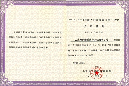 近日,我公司被國(guó)家工商行政管理總局授予“全國(guó)守合同重信用企業(yè)”稱號(hào),這是公司連續(xù)六年獲此殊榮,是山東省建筑裝飾行業(yè)唯一一家被銀行授信AAA級(jí)的企業(yè)。