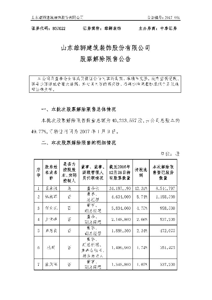 > [臨時公告]雄獅裝飾股票解除限售公告