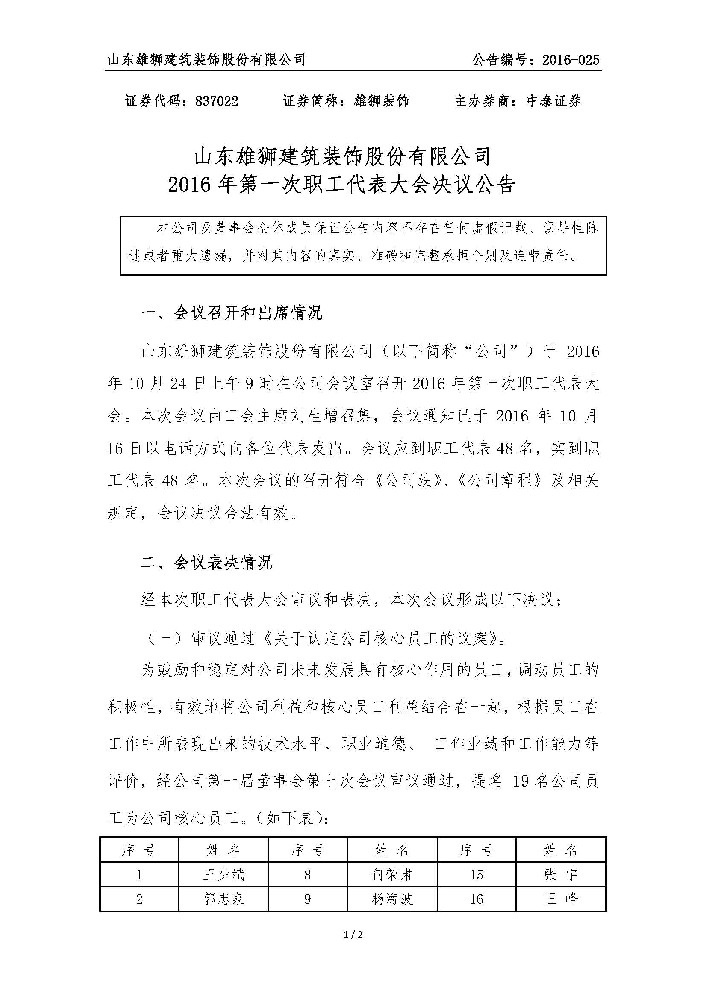 > [臨時公告]雄獅裝飾2016年第一次職工代表大會決議公告