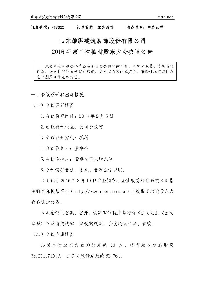 > [臨時公告]雄獅裝飾_2016年第二次臨時股東大會決議公告