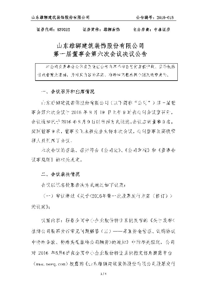 [臨時公告]雄獅裝飾_第一屆董事會第六次會議決議公告